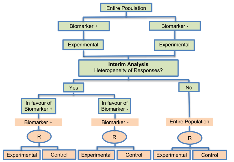 - Decision making and the number of patients used at the second stage of the trial are based on the observed response rates during the first stage of the trial. This approach depends on the identification of heterogeneity between the two biomarker-defined subgroups (positive and negative subgroups).