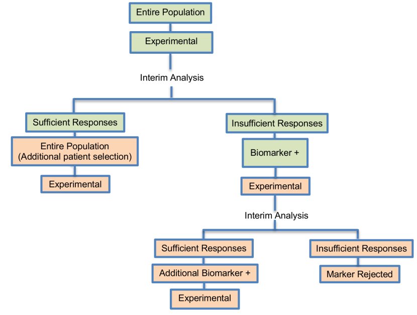 - Although the two stages could be run separately, i.e. one for the biomarker-positive subgroup and the other for the unselected patients, the performance of the study in this way can increase the duration and costs of the trial. Consequently, it will be better to run the study in just one trial so as to have a more seamless study.